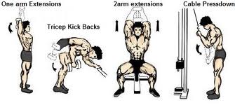 Triceps Fondos en barra paralelas Presiones en polea con barra o soga si es el caso Press con barra agarre angosto en banco plano Press frances con barra Z y con mancuernas en banco plano 1) Copa a una manco con mancuerna 2) Patada con mancuerna a una mano 3) Copa a dos manos sentado en banco 4) Jalón en polea con barra o soga
